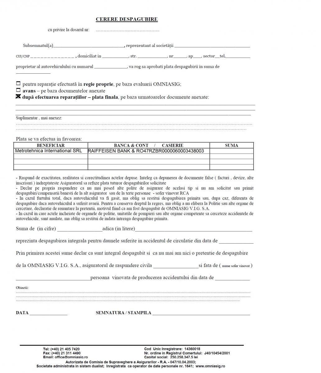 ◊ BONUS 5% din valoarea facturii de daune, decontate de Asigurator, pentru orice lucrare sau achiziţie viitoare la Service Metrotehnica.