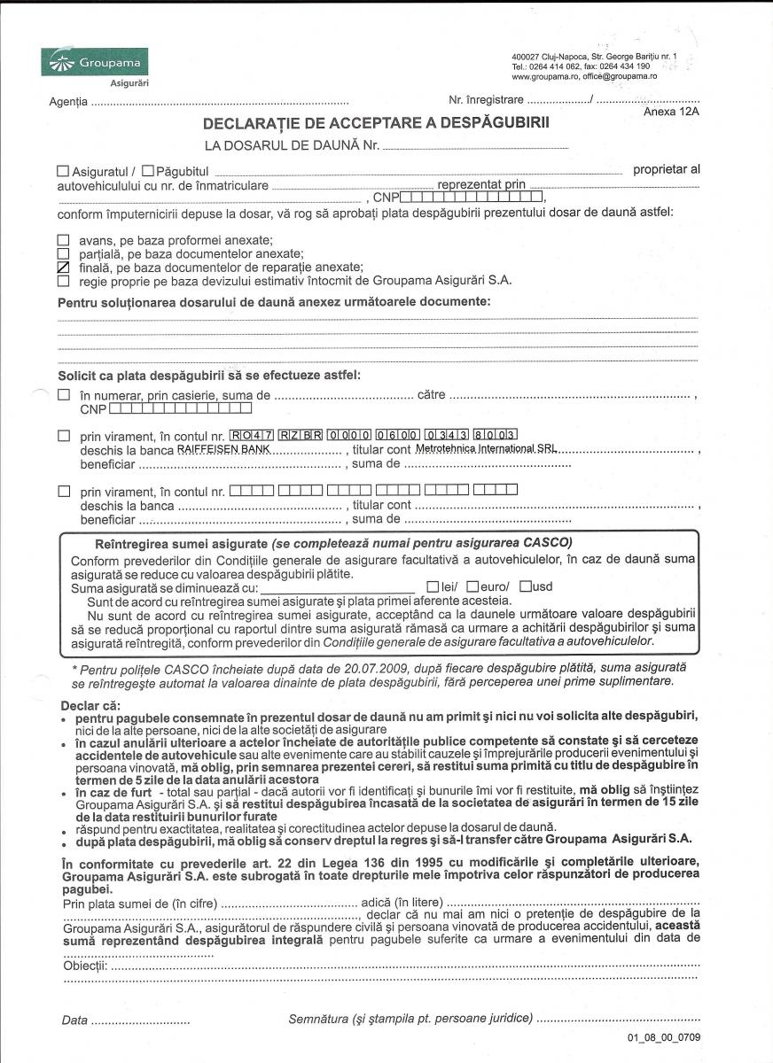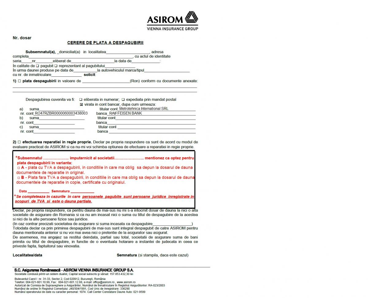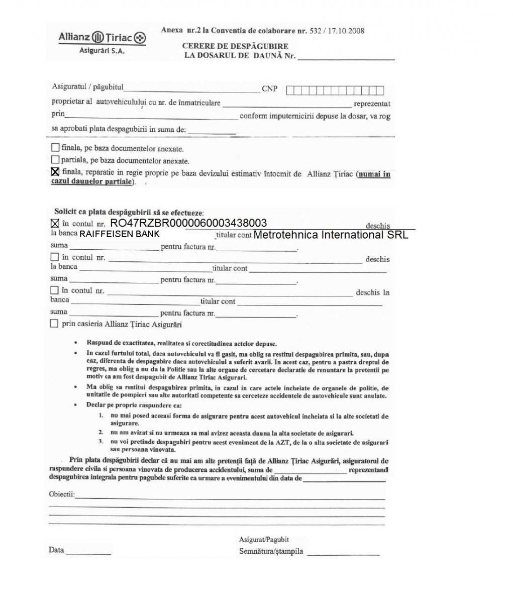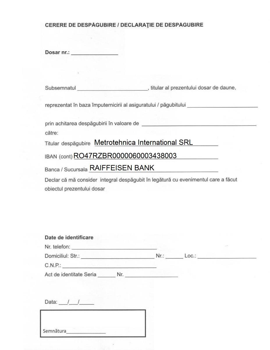 ◊ BONUS 5% din valoarea facturii de daune, decontate de Asigurator, pentru orice lucrare sau achiziţie viitoare la Service Metrotehnica.